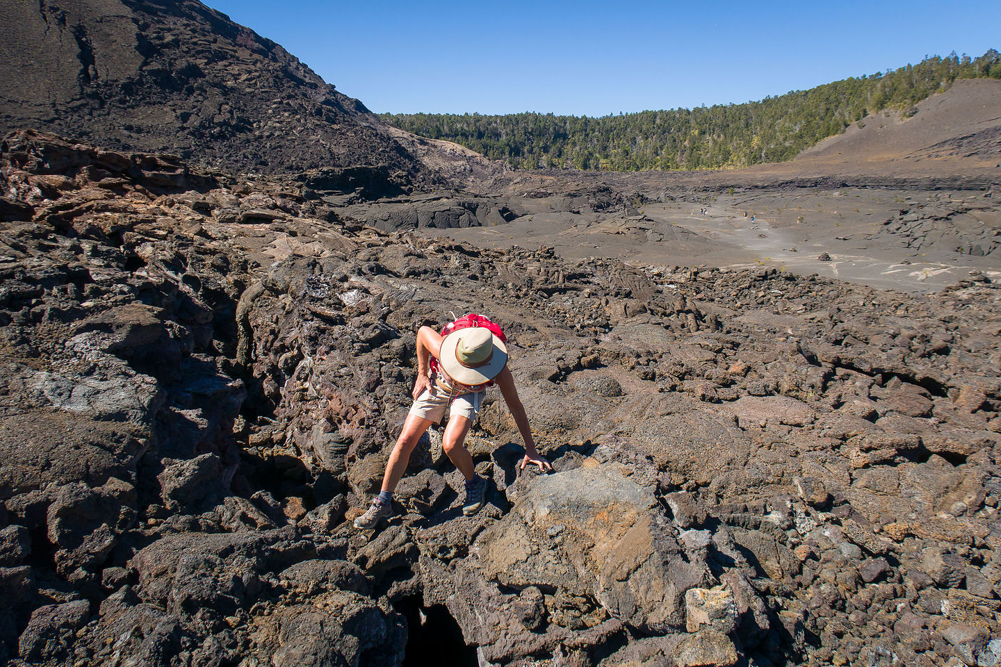 Lolo scrambling up to a Steam Vent in Kilauea Iki Crater