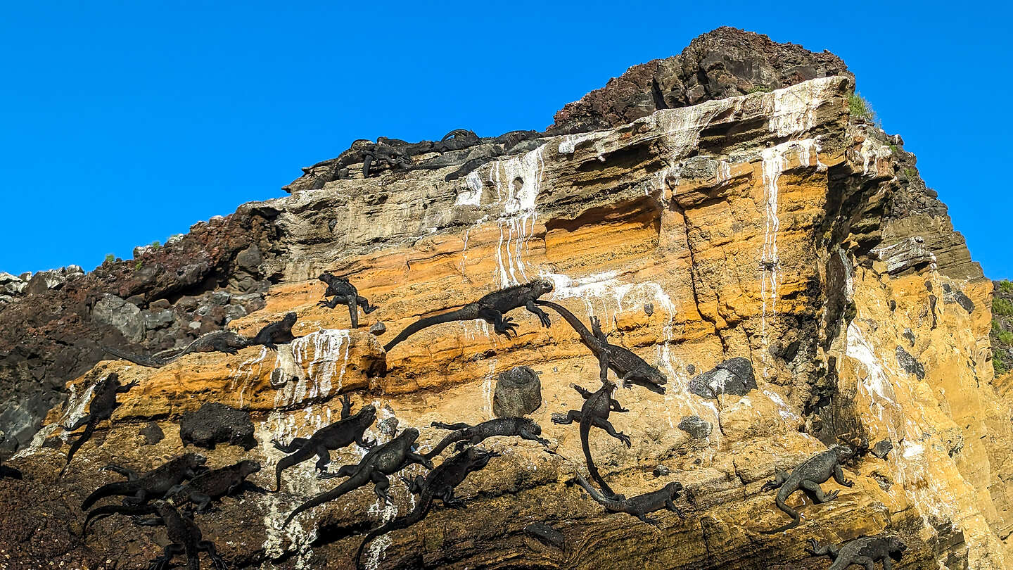 Marine Iguanas warming up on the cliffs