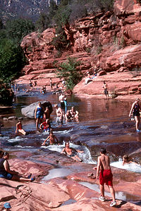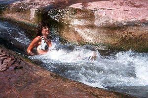 Herb slides too!Slide Rock State Park, located about halfway along the Oak Creek Canyon Drive, is one of Arizona's most popular natural playgrounds. The park contains a 70-foot natural water slide that flows over algae-covered sandstone. Although the water is chilly and the ride is rough, it is a tremendously fun way to spend a hot afternoon. There is a small admission fee to enter.