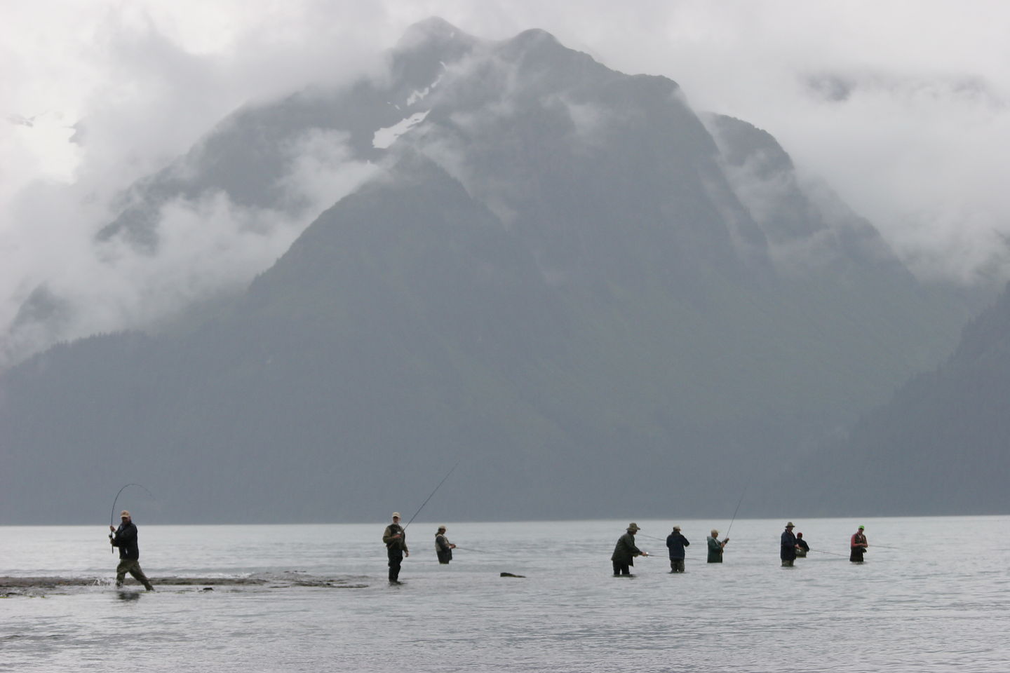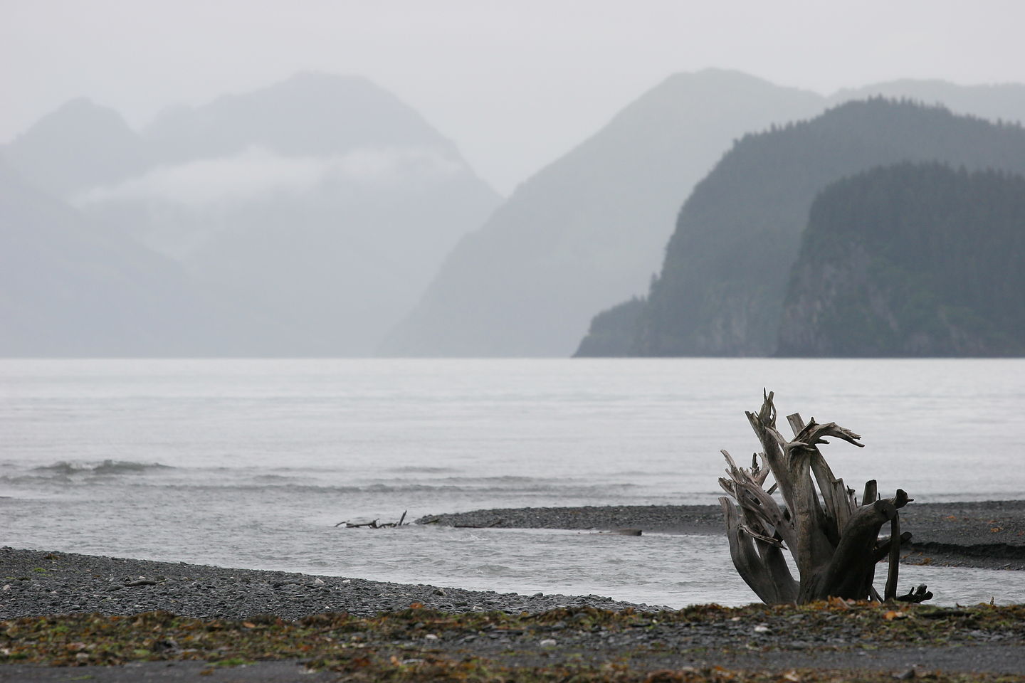 Caine's Head Coastal Trail FishingAs we approached Seward, the fine mist that we had become so used to had now turned to a steady rain. This weather was certainly getting tiresome. We passed right through the town of Seward and headed out to Lowell Point where we had reservations at Miller's Landing. The 3-mile dirt road out to the Point was solid mud and so full of potholes that we had to crawl along at less than 10 mph. I seriously worried whether we would be able to get out of here if the rain continued. Finally, we got to Miller's Landing, a campground right on Resurrection Bay, which would have been wonderful under better conditions. The campground has 30 sites, 15 of which overlook the beach and the mountains and glaciers across the bay. Fortunately, I had reserved the last 2 beach sites. We were assigned one sandwiched between the office and a dumpster. At first I was upset about the aesthetics, but after Herb pulled the RV up a little further (so the dumpster was not right outside our window), our now unimpeded view up the beach became spectacular.