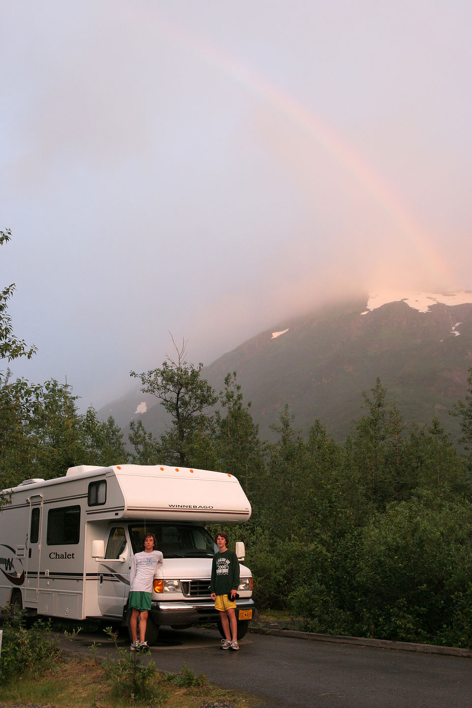 Rainbow over Winnie with boysWhile waiting, I decided to call the Homer Spit Campground, just to make sure we would have no trouble getting 2 beach-front sites for tomorrow and the next couple of nights. I had called a few weeks ago from home and had been assured that it shouldn't be a problem and that reservations weren't necessary. We really like to avoid making reservations whenever possible because we don't like being tied down to a strict itinerary. The downside, however, is that sometimes you miss out on something you really want to do. Sure enough, the guy on the phone told me that there were no more beach sites available for the next few nights. I panicked and called a commercial campground that was not on the Spit but claimed to have water views, and I made a reservation for 2 nights, 2 nights from now, leaving the next night open to chance. I wasn't real sure if this was the right thing to do, because I had a feeling that the Spit was the place to be when staying in Homer. Well, I guess we would see tomorrow.