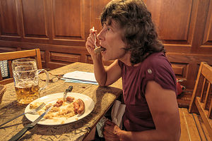 Lolo enjoying wurst at the famous Hofbrauhaus
